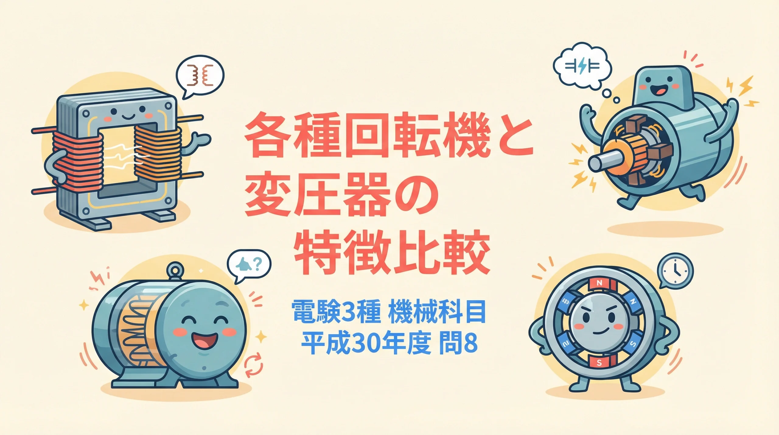 今回解説するのは、電験3種 機械科目 平成30年度 問8(書籍では問33として掲載)です。テーマは「各種回転機と変圧器の特徴比較」。変圧器・誘導電動機・直流電動機・同期電動機という4つの主要な電気機器について、その共通点と相違点を正しく理解することが求められます。