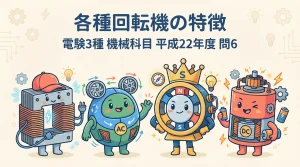 電験3種 機械科目 平成30年度 問8は、変圧器・直流電動機・誘導電動機・同期電動機の共通点と相違点を問う「穴埋め選択問題」です。各機器の原理・等価回路・制御方式の特徴をしっかり理解していれば確実に正解できます。この記事では、スライドに沿って一問一答形式でわかりやすく解説します。