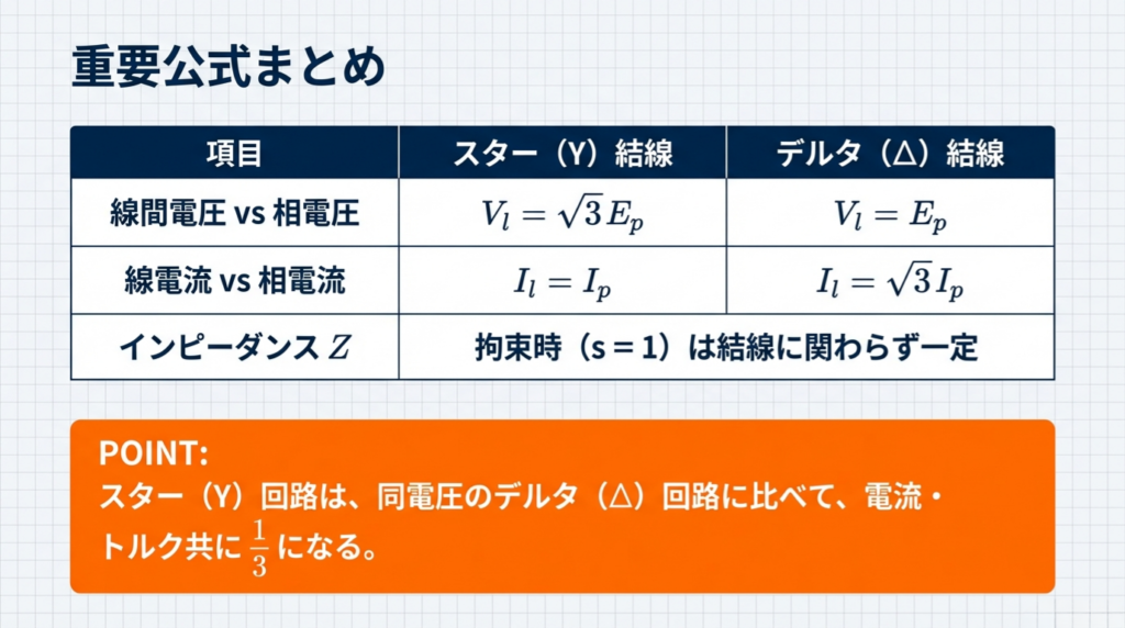 - 電圧の低下: Y結線の相電圧は $\Delta$ の $1/\sqrt{3}$ 倍になる。