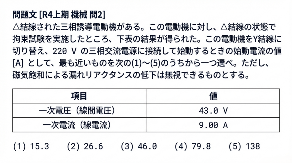 デルタ($\Delta$)結線で試験したデータを使って、スター(Y)結線で始動したときの電流を予測する、という実務的なシチュエーションの問題です。