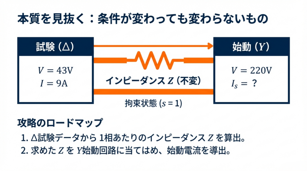 この問題を解く鍵は、**「インピーダンス $Z$ は結線を変えても変わらない」**という点です。