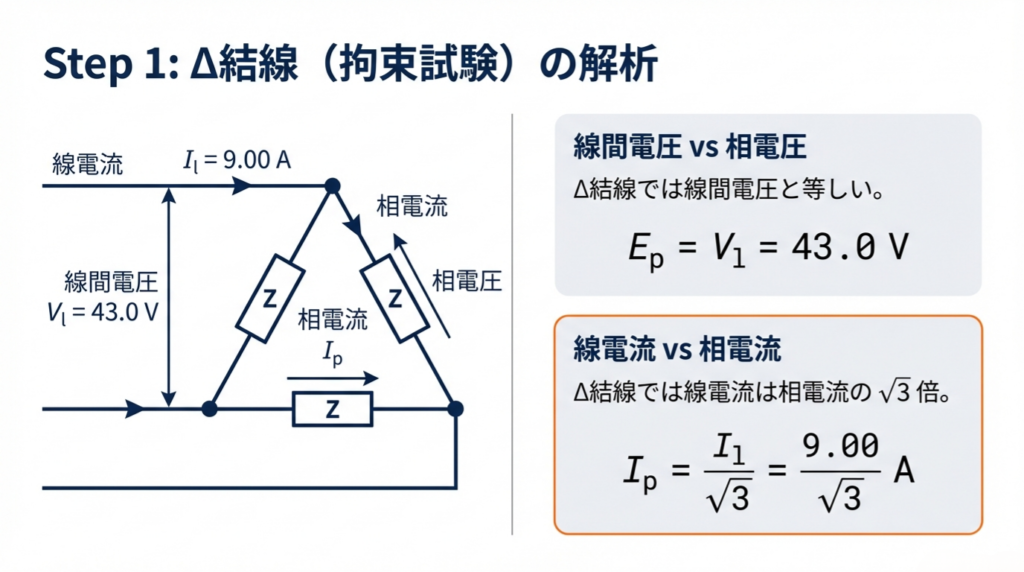まずは試験時のデータからインピーダンスを求めます。$\Delta$結線の特徴を思い出しましょう。