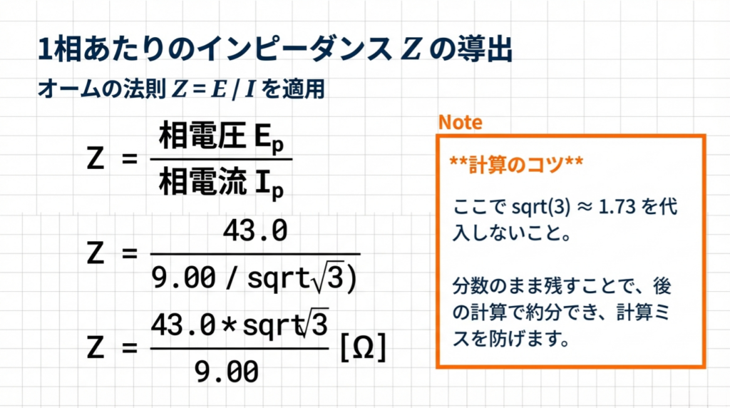 オームの法則($Z = E/I$)を使って、1相あたりのインピーダンス $Z$ を求めます。