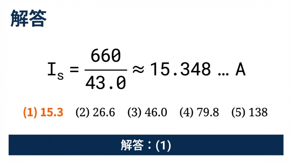 $$I_s = \frac{660}{43.0} \approx 15.348 \dots \text{ A}$$