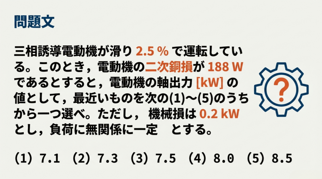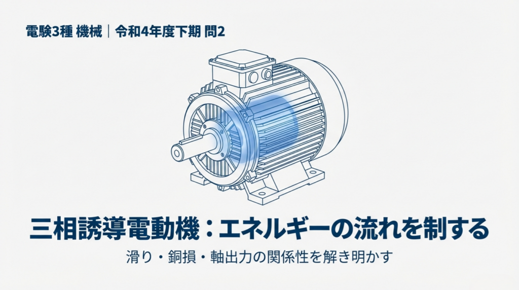 今回は、令和4年度下期 問2 を題材に、滑り・銅損・軸出力の関係を、スライドに沿って初心者の方にもわかりやすく解説します。