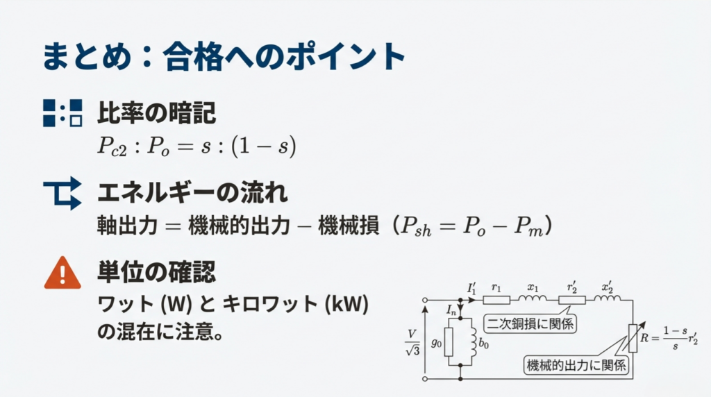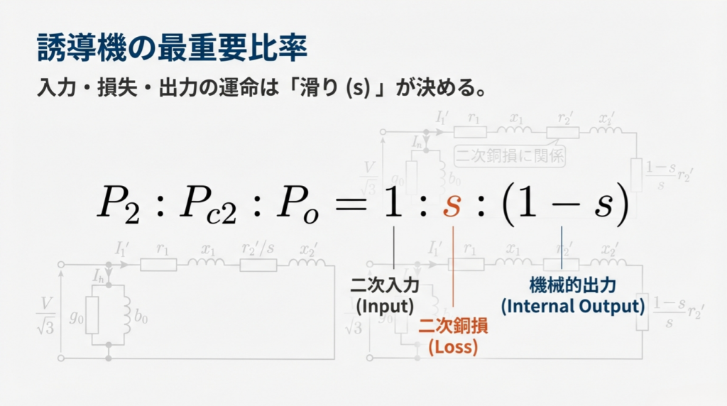 つまり、「銅損」と「機械的出力」の比率は、「滑り $s$」と「$1-s$」の比率そのものなのです。