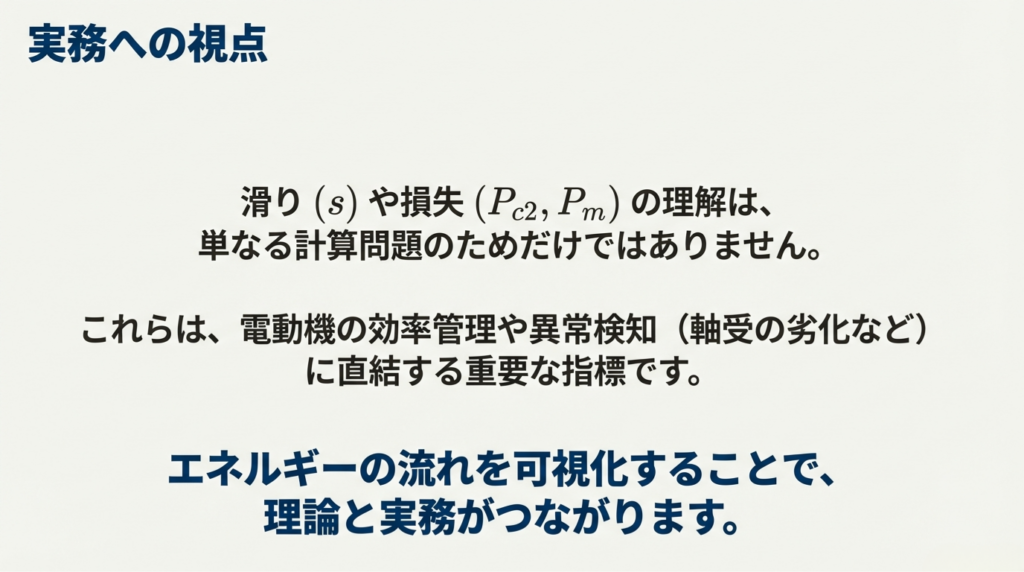 滑り $s$ や損失(銅損、機械損)を理解することは、モーターの効率管理異常検知(ベアリングの劣化で機械損が増えるなど)に直結します。