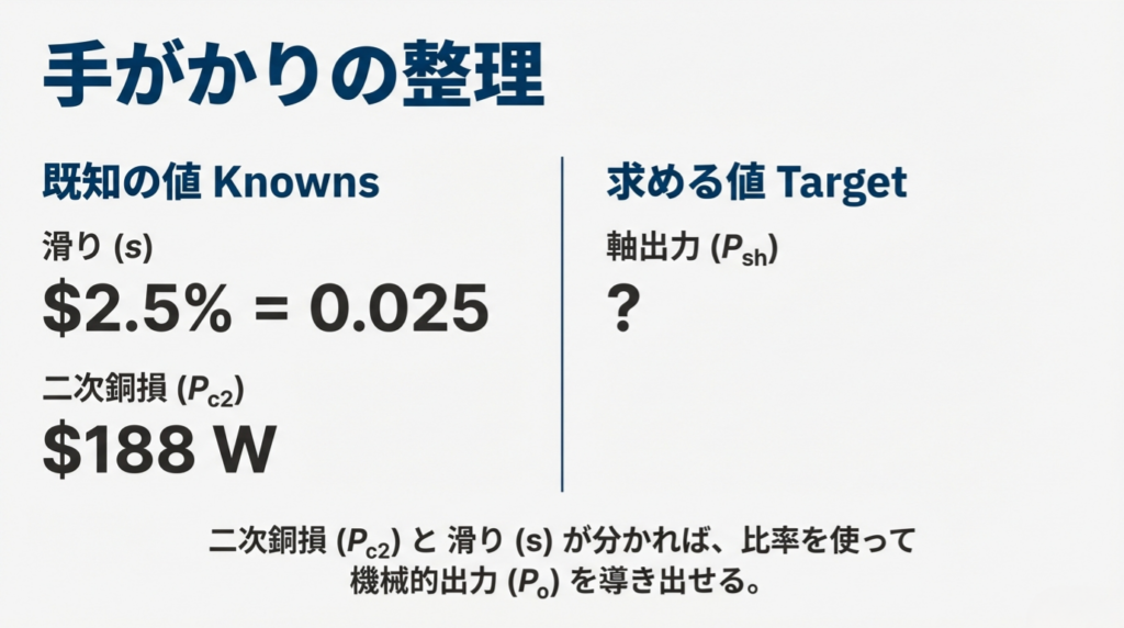 まずは、ヒントを使って「機械的出力 $P_o$」を求め、そこからゴールを目指す作戦でいきます。
