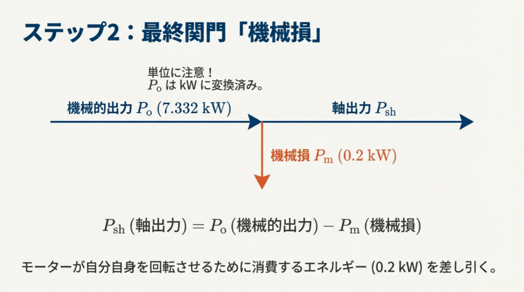 2. エネルギーの流れ: 「軸出力 = 機械的出力 – 機械損」という引き算を忘れない。