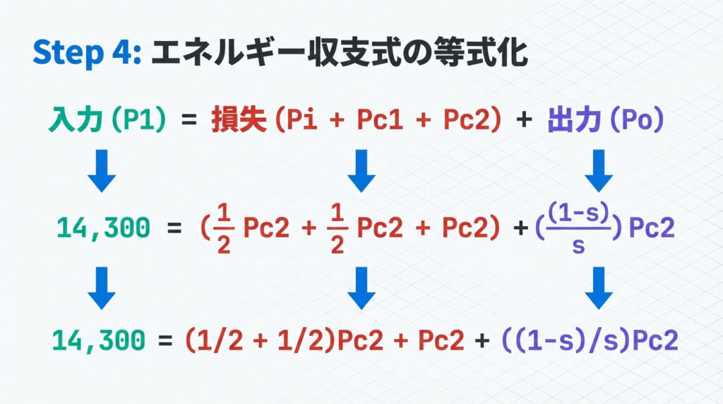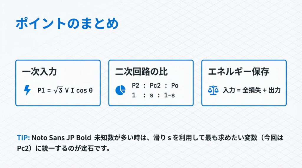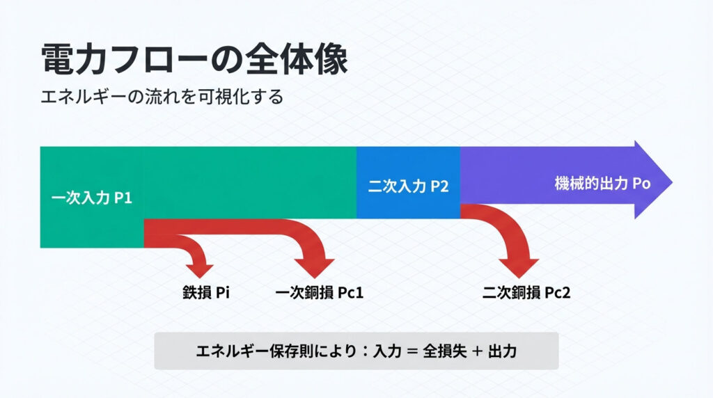 誘導機の計算をミスなく進めるコツは、エネルギーの流れを可視化することです 。