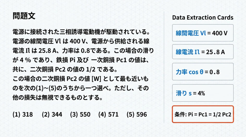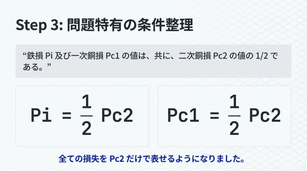 問題文にある「鉄損と一次銅損は、二次銅損の半分」という条件を適用します 。