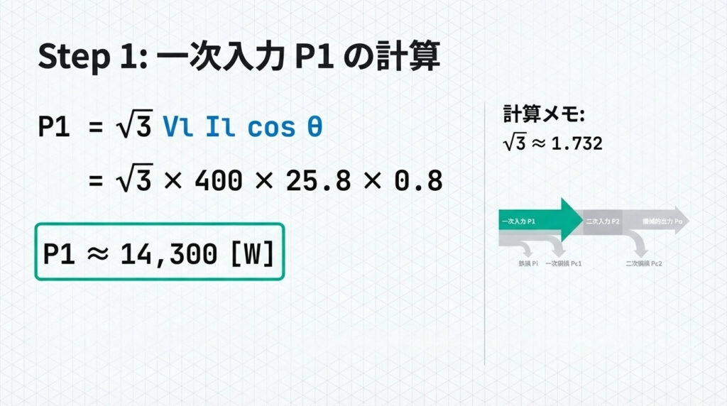 - 公式の暗記: 一次入力 $P_1 = \sqrt{3} V I \cos \theta$ 。