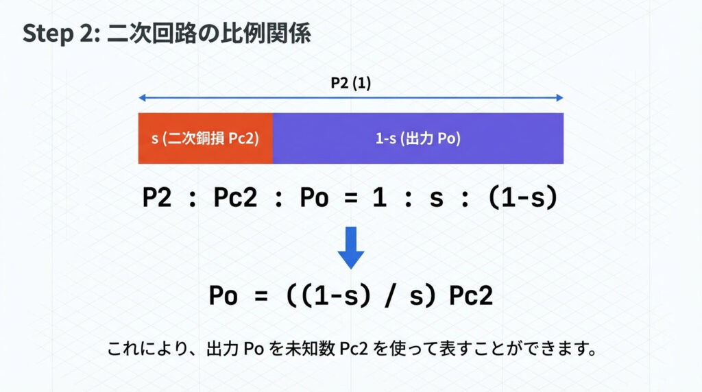 この関係式を使うことで、未知数である出力を、求めたい変数である二次銅損 $P_{c2}$ で表すことができます 。