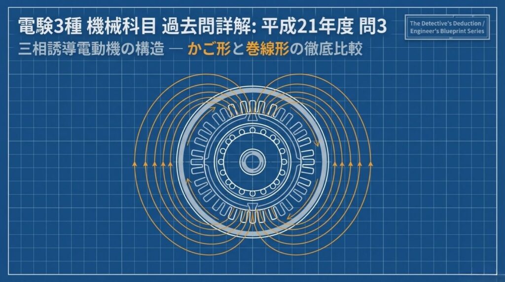 #49【電験3種 機械 H21 問3】三相誘導電動機の構造(かご形・巻線形)を徹底解説!端絡環とスリップリングの違い