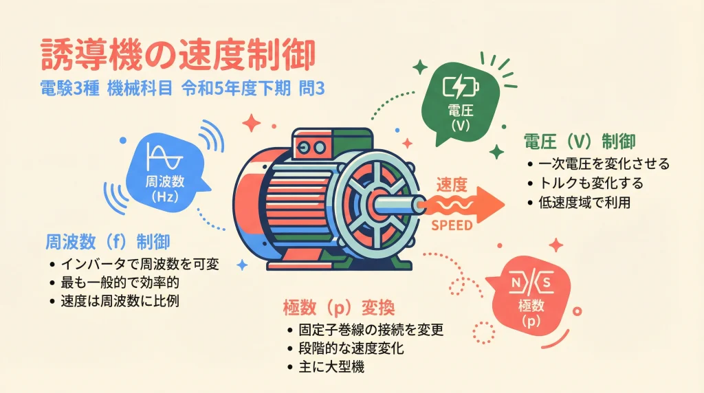 電験3種 機械科目 令和5年度下期 問3の過去問を徹底解説!誘導機の速度制御の重要公式、VVVF制御、極数切換、二次抵抗制御(比例推移)の原理を、豊富な図解でわかりやすく説明します。